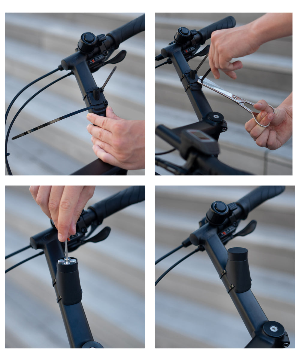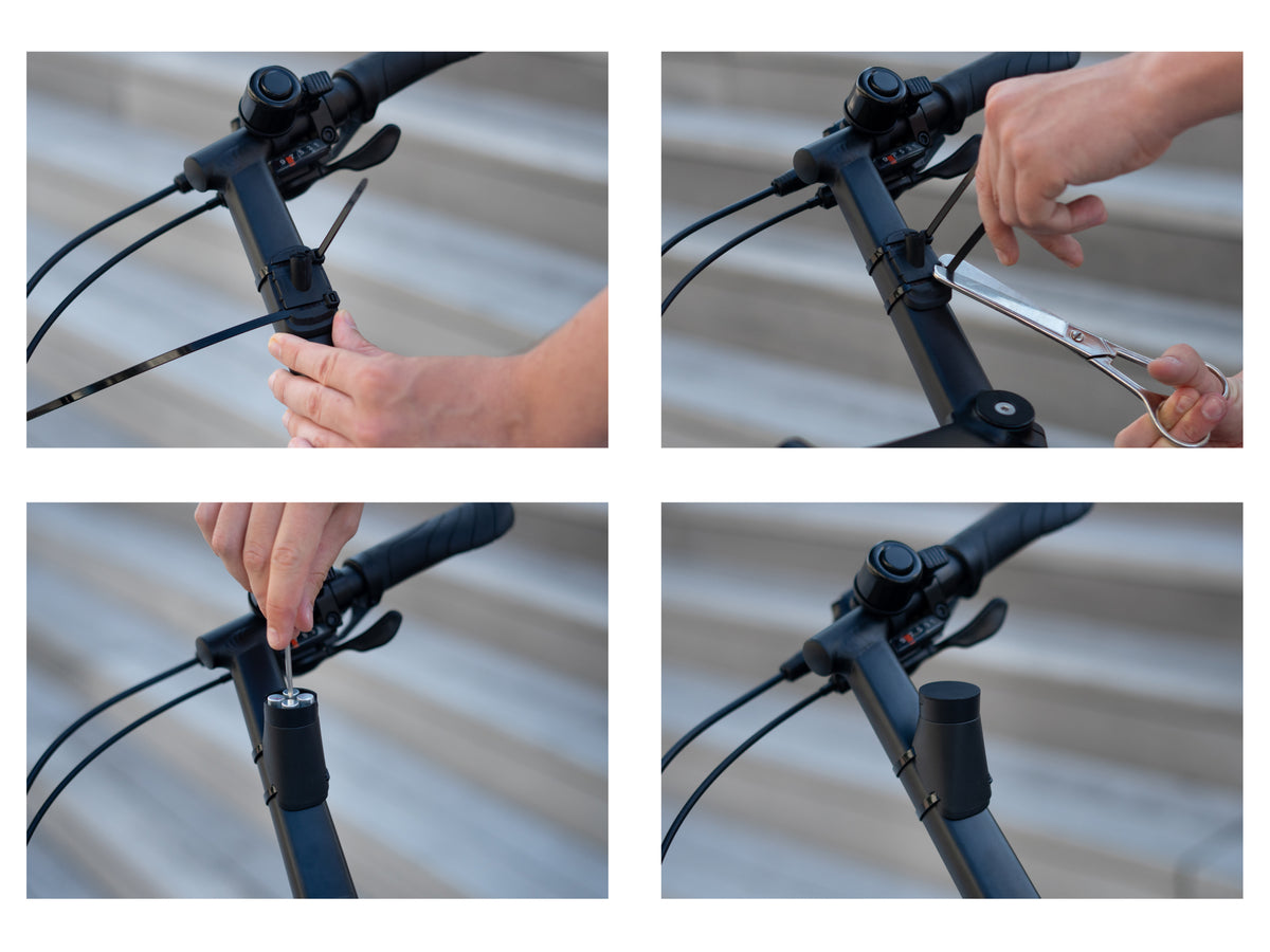 2. Placez les serflex dans les emplacements prévus, retirez l'autocollant, collez le support sur le guidon, serrez les serflex et coupez l'excédent.